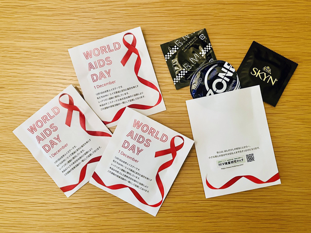 12月1日の世界エイズデーに合わせ、HIV検査相談窓口を案内したオリジナル袋入りコンドームを中西ゴム工業株式会社様、ジェクス株式会社様、不二ラテックス工業株式会社様の