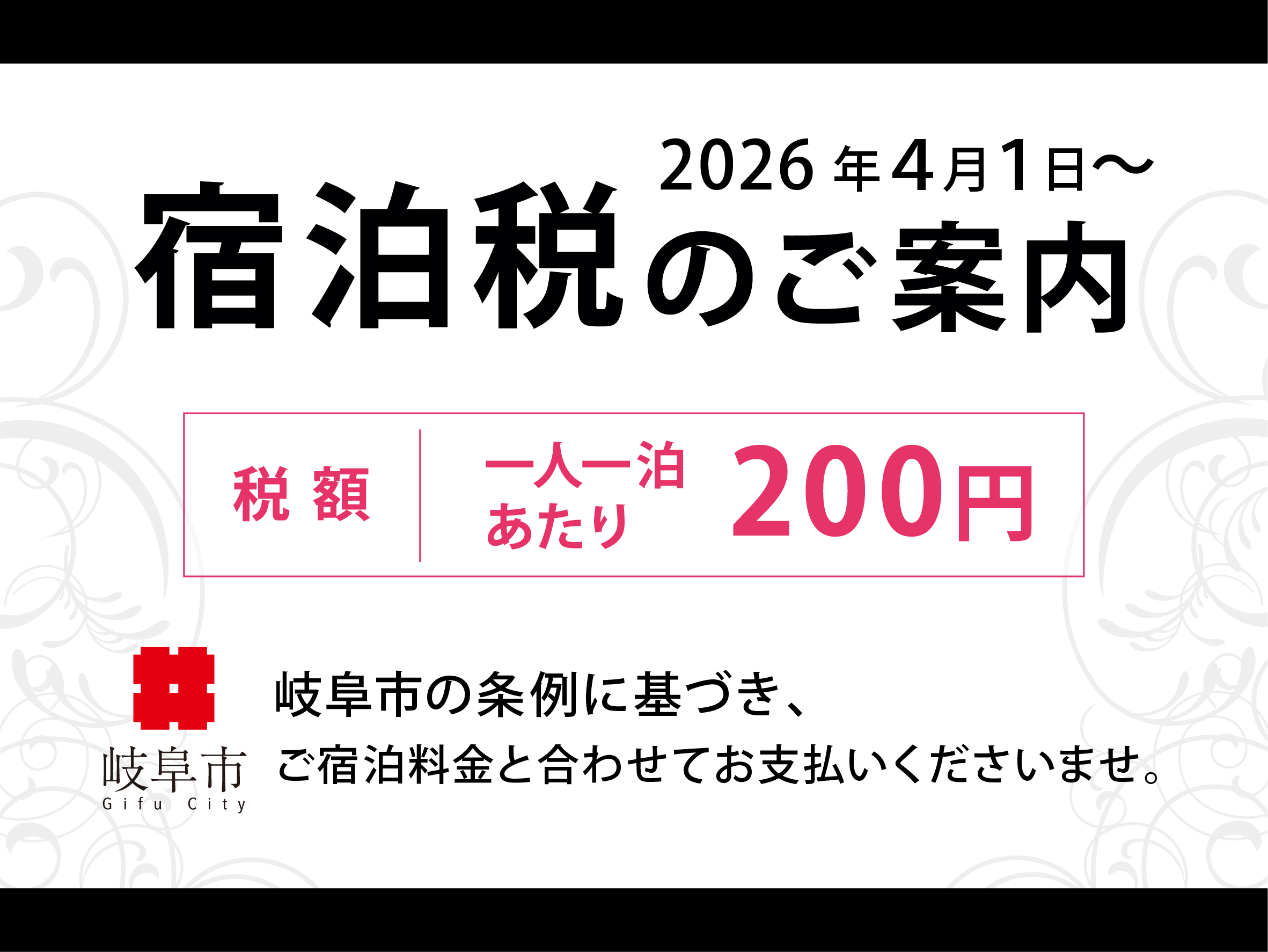 宿泊税開始のご案内 岐阜市では、2026年4月1日(水)宿泊分より1人1泊あたり200円の宿泊税が導入されます。 ご宿泊でご利用の際は、人数に応じて客室料金とは別途で請求させていただきますのでご案内申し上げます。 ※12歳未満は非課税