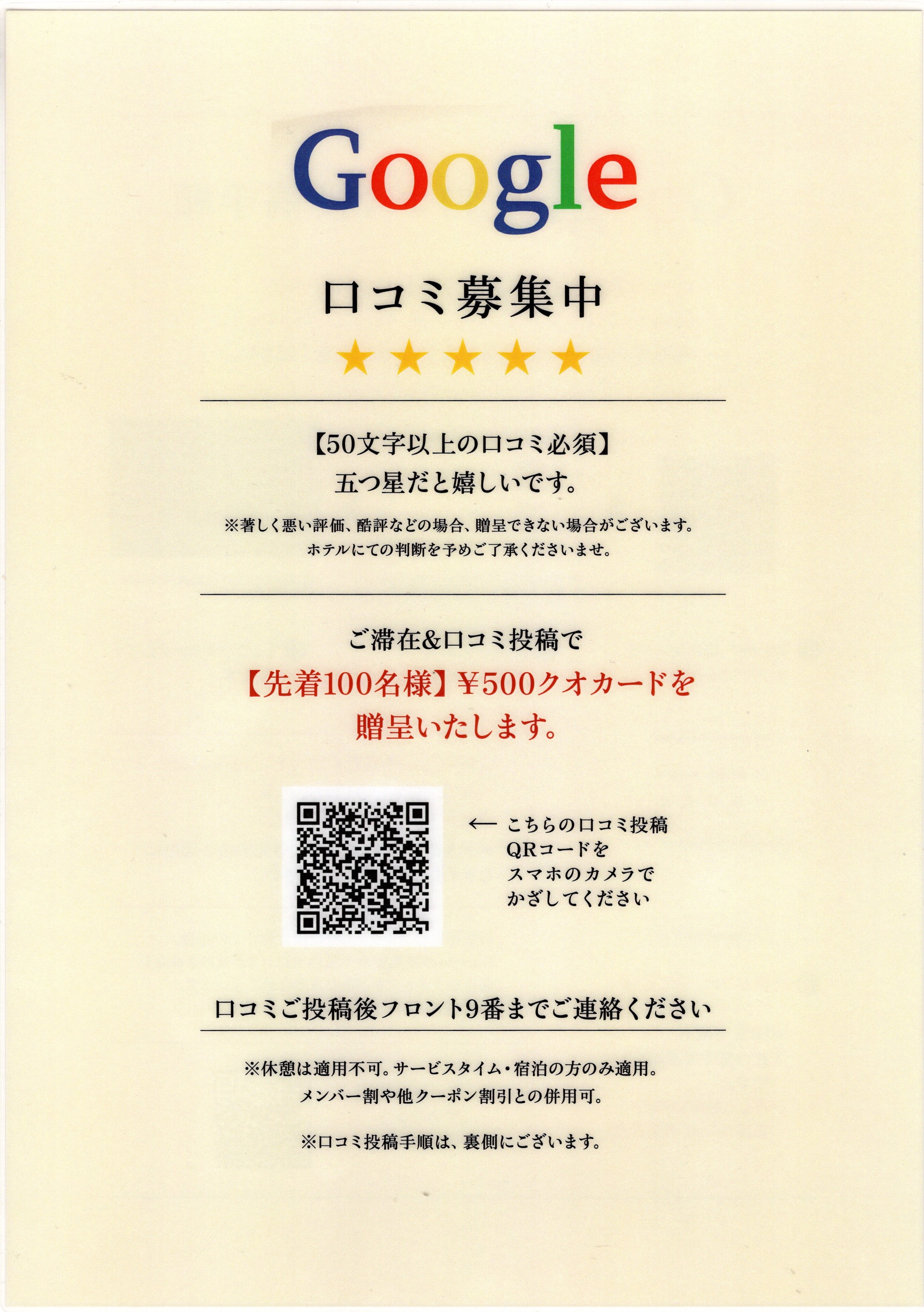 口コミ頂きましたらST・ご宿泊で500円OFF!