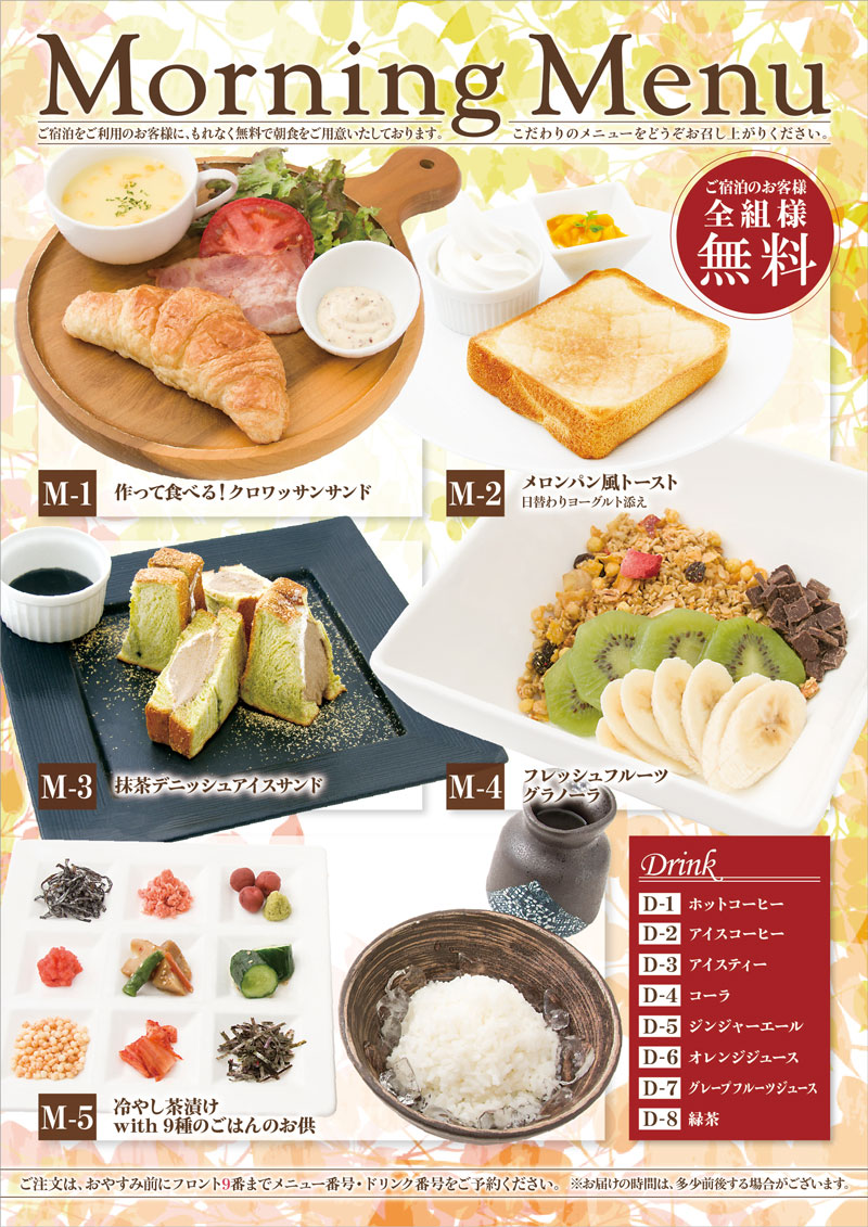 無料ウェルカムドリンク / 有料モーニング / オリジナルメニュー / オリジナルデザートメニュー / レストランメニュー24H対応 / 1人利用可 / 3人以上利用可 / WiFi有 / 法人名領収書発行可
